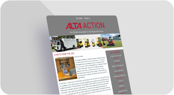 PAGE 01 ACTION VOLUME 1 ISSUE 5 The Official Newsletter of Alta Equipment Group A Note From The CEO PAGE 01 Material Handling PAGE 04 & 05 E-Mobility PAGE 09 Construction Equipment PAGE 06 & 07 Human Resources PAGE 10 Finance PAGE 11 Information Technology PAGE 12 & 13 Marketing PAGE 14 Our Culture PAGE 02 IN THIS ISSUE: Alta Cares PAGE 15 Safety Is Our Workstyle PAGE 03 A NOTE FROM THE CEO Alta Map PAGE 16 Ecoverse PAGE 08 Dear Alta Team, In our last newsletter, I shared how Alta’s strategy centers on *delivering trust that makes a difference*—a purpose that guides how we operate, serve our customers, and grow as a team. We also highlighted our Guiding Principles —Invest in the Best, Passion for Excellence, Mutual Respect, One Team, and Customers for Life. These principles are not just values on paper—they’re tools we use every day to navigate complexity and stay aligned to our mission. In this issue, I want to go a level deeper and talk about the execution focus areas that bring our strategy to life: optimizing our business, delighting our customers, and developing and retaining top talent. These priorities work together, anchored in our purpose-driven culture. When team members are truly empowered—when they understand the mission and feel ownership—they make faster, better decisions. And when we deeply understand our customers, we don’t just sell—we solve. We deliver the right product to the right customer, because we’ve listened first. This is how Alta earns long-term loyalty and sets the standard in every market we serve. To our people: thank you. Your perseverance through tough macroeconomic conditions, shifting demand patterns, and general uncertainty has been remarkable. Because of you, Alta continues to grow, evolve, and lead. I’d also like to extend a warm welcome to our newest team members in Quebec—bienvenue à Alta! We’re excited to have you onboard. Together, we’ll keep building a company where excellence is our standard, culture is our catalyst, and trust is our most valuable asset. Best regards, Ryan Greenawalt Alta Equipment Group