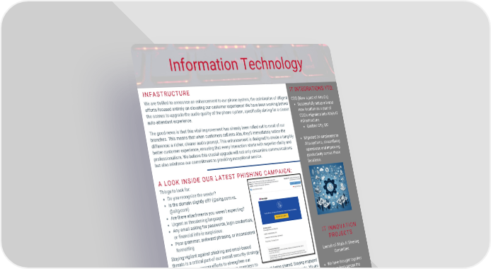 PAGE 13 Information Technology INFASTRUCTURE IT INTEGRATIONS YTD: General IT issues and requests: [email protected] ERP issues and requests: [email protected] IT security concerns or requests/report suspicious emails: [email protected] Tech Tool, CE technician software related issues: [email protected] PC Service Tool, MH technician software related issues: [email protected] Dayforce issues, HR requests: [email protected] Concur issues: [email protected] We are thrilled to announce an enhancement to our phone system, the culmination of diligent efforts focused entirely on elevating our customer experience! We have been working behind the scenes to upgrade the audio quality of the phone system, specifically aiming for a clearer auto attendant experience. A LOOK INSIDE OUR LATEST PHISHING CAMPAIGN: SUPPORT CONTACTS CEQ (Now a part of Alta Ca) Successfully setup a brand new location as a part of CEQ's migration into Alta’s IT infrastructure: Quebec City, QC Migrated 34 employees to Alta systems, streamlining operations and improving productivity across these locations. IT INNOVATION PROJECTS Launch of Alta's AI Steering Committee We have brought together leaders from across the business to shape a responsible, strategic approach to artificial intelligence. The committee’s goal is to align AI initiatives with Alta’s core values and business strategy, focusing first on improving internal operations and empowering our people. The good news is that this vital improvement has already been rolled out to most of our branches. This means that when customers call into Alta, they'll immediately notice the difference: a richer, clearer audio prompt. This enhancement is designed to create a tangibly better customer experience, ensuring that every interaction starts with superior clarity and professionalism. We believe this crucial upgrade will not only streamline communications but also reinforce our commitment to providing exceptional service. Do you recognize the sender? Is the domain slightly off? (@ailtg.com vs. @altg.com) Are there attachments you weren’t expecting? Urgent or threatening language Any email asking for passwords, login credentials, or financial info is suspicious. Poor grammar, awkward phrasing, or inconsistent formatting Things to look for: Staying vigilant against phishing and email-based threats is a critical part of our overall security strategy. As part of our ongoing efforts to strengthen our security culture, we encourage all team members to IT SECURITY IS A TEAM SPORT!! stay informed and remain attentive to the awareness content being shared. Staying engaged helps ensure we are all better prepared to recognize and respond to potential threats. We are already seeing measurable improvements in our phishing simulation scores, a strong sign that our collective efforts are making a real impact.