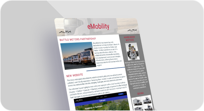 PAGE 09 HARBINGER MOTORS eMobility BATTLE MOTORS PARTNERSHIP NEW WEBSITE The newly redesigned Alta eMobility website (emobility.altg.com) now delivers a more polished, user-friendly experience—featuring clean, modern visuals and intuitive navigation across key sections like vehicles, charging, hydrogen, services, incentives, and news. Alta eMobility has teamed up with Battle Motors to bring the latter’s Class 6–8 electric trucks—namely the Striker and Raider—to fleet customers as part of a turnkey electrification solution. This collaboration lets Alta handle everything from deployment to service and charging infrastructure, offering fleets robust, heavy‑duty electric vehicles backed by full support. The refreshed layout highlights their end-to-end approach with a clear four-step roadmap (Assess → Define → Execute → Maintain), enhanced imagery of partner EVs like Harbinger and Battle Motors, and prominently surfaced incentives and resources—making it easy for fleet managers to explore electrification options at a glance. There are a ton of EV incentives and voucher programs rolling out right now—federal, state, and utility-based—and they can add up to huge savings for our customers. If you have someone interested in electric vehicles, loop in the Alta eMobility team. We can help navigate the options and make sure your customers are getting every dollar they qualify for. Let’s help them save some serious money! STATE AND FEDERAL VOUCHERS AND INCENTIVES Harbinger Motors develops modular medium-duty electric chassis for Class 4–6 applications. Their platforms feature in-house 800V liquid-cooled battery packs, integrated electric axles, and are engineered for durability, with a service life rated at 450,000 miles. This vertical integration ensures high performance, reliability, and scalability for a range of commercial operations. For box truck configurations, Harbinger partners with Sevna Composite Cabs. Sevna provides lightweight, ergonomic, and customizable cabs designed for Class 4–6 vehicles, enhancing driver comfort and operational efficiency. Together, the Harbinger chassis and Sevna cabs offer a complete, zero-emission solution for medium-duty fleets. SEVNA