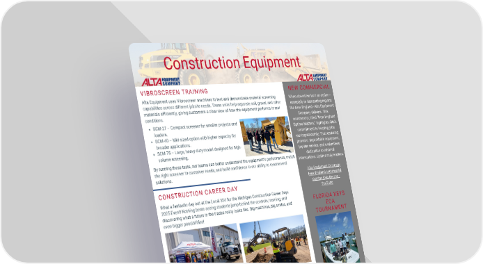 PAGE 06 NEW COMMERCIAL Construction Equipment VIBROSCREEN TRAINING FLORIDA KEYS ECA TOURNAMENT When downtime isn’t an option— especially in demanding regions like New England—Alta Equipment Company delivers. This commercial, titled “New England Uptime Matters,” highlights Alta’s commitment to keeping jobs moving smoothly. Their enduring promise: dependable equipment, top-tier service, and a relentless dedication to minimal interruptions. Uptime truly matters. Alta Equipment uses Vibroscreen machines to test and demonstrate material screening capabilities across different jobsite needs. These units help separate soil, gravel, and other materials efficiently, giving customers a clear view of how the equipment performs in real conditions. NEW YORK SALES AWARDS Alta Equipment Company New England commercial starring Kyla Greene - YouTube By running these tests, our teams can better understand the equipment’s performance, match the right screener to customer needs, and build confidence in our ability to recommend solutions. SCM-27 – Compact screener for smaller projects and loaders. SCM-40 – Mid-sized option with higher capacity for broader applications. SCM-75 – Large, heavy-duty model designed for high- volume screening. Team Alta recently took 2nd place in the 2025 ECA tournament in the Florida Keys. Congrats to team members Tommy Ball, Jorge Correa, Josh McDonald, David Herrera, and Alberto Irizarry. Way to represent Alta! What a fantastic day out at the Local 324 for the Michigan Construction Career Days 2025 Event! Nothing beats seeing students jump behind the controls, learning, and discovering what a future in the trades really looks like. Big machines, big smiles, and even bigger possibilities! CONSTRUCTION CAREER DAY We are proud to recognize our outstanding team members in New York for their achievements this year: Heavy Equipment Sales Rep of the Year – Matt Flowers Compact Equipment Sales Rep of the Year – Andy Shultz Congratulations to both winners for their hard work, dedication, and excellence!