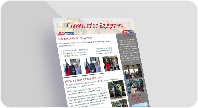 PAGE 07 Construction Equipment We are proud to recognize our outstanding team members in New England for their achievements this year: Most Excavator Sales – William Harvey Best Social Media – Richard Loabe Salesman of the Year – Ryan Sears NEW ENGLAND SALES AWARDS LEEBOY’S 2024 AWARD RECIPIENT REMA GREAT LAKES REGIONAL CONFERENCE OPEN HOUSES We are excited to announce that Alta Equipment Michigan has been recognized as LeeBoy’s 2024 Top Product Support Dealer! Pictured: Travis Colwell – Director, Road Products Segment (Alta) Bill Ehrhart – Service Manager, Road Segment (Alta) Jason Lapp – Road Products Specialist (Alta) Doug Thompson – Regional Sales Manager (LeeBoy) From on-site application training by our product specialists to expert service by factory-trained technicians, dedicated to asphalt and concrete paving equipment, this award highlights a team that’s all-in on uptime, reliability, and real-world support. At Alta, service isn’t just a department, it’s a commitment. A testament to our Road Products team’s unwavering dedication to customer success long after the sale. Nothing beats a day on the water with great company! We had a blast at the ReMA Great Lakes Regional Conference, where we proudly sponsored a boat for the fishing trip. What an incredible couple of weeks! From Traverse City to Jackson, our open houses were packed with live demos, great conversations, food, games, and even better company. A huge THANK YOU to everyone who stopped by, asked questions, climbed in the cab, and spent time with our team—we loved having you! Congratulations to all three winners for their hard work, dedication, and excellence! Alta Ohio was proud to be a major sponsor at this year’s Monster Truck Jam at Covelli Center in Youngstown, Ohio! Huge shout out to Government Segment Manager Don D’Onofrio and the entire Alta Ohio Team for making this event such a success! Such an amazing opportunity to showcase our Develon Loader and share all our incredible products. MONSTER TRUCK JAM