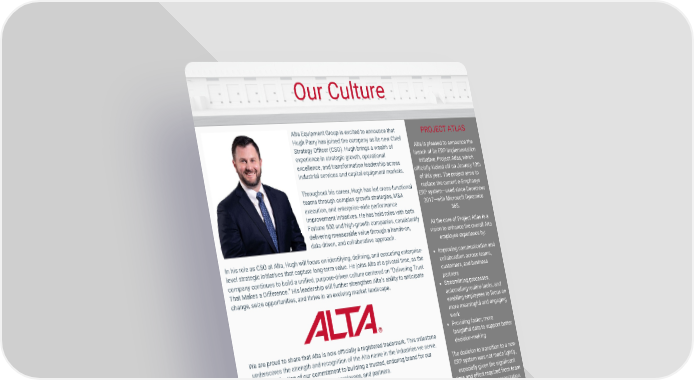 PAGE 02 Invest In The Best Passion For Excellence Mutual Respect One Team Customers For Life Our Culture PROJECT ATLAS OUR PURPOSE STATEMENT Delivering Trust That Makes A Difference OUR GUIDING PRINCIPLES MISSION AND VALUES More than an equipment company, Alta is an innovator of solutions, delivering diverse products, and unrivaled support centered on building lasting customer relationships. Alta Equipment Group is excited to announce that Hugh Parry has joined the company as its new Chief Strategy Officer (CSO). Hugh brings a wealth of experience in strategic growth, operational excellence, and transformation leadership across industrial services and capital equipment markets. Throughout his career, Hugh has led cross-functional teams through complex growth strategies, M&A execution, and enterprise-wide performance improvement initiatives. He has held roles with both Fortune 500 and high-growth companies, consistently delivering measurable value through a hands-on, data-driven, and collaborative approach. Alta is pleased to announce the launch of its ERP implementation initiative, Project Atlas, which officially kicked off on January 13th of this year. The project aims to replace the current e-Emphasys ERP system—used since December 2017—with Microsoft Dynamics 365. At the core of Project Atlas is a vision to enhance the overall Alta employee experience by: Improving communication and collaboration across teams, customers, and business partners Streamlining processes, automating routine tasks, and enabling employees to focus on more meaningful and engaging work Providing faster, more insightful data to support better decision-making The decision to transition to a new ERP system was not made lightly, especially given the significant time and effort required from team members across the organization. Currently, more than 50 employees are deeply involved in the project on a daily basis, with many others stepping up to ensure business operations continue smoothly. Alta leadership extends sincere thanks to everyone contributing to Project Atlas and demonstrating a true Passion for Excellence throughout this important transformation. In his role as CSO at Alta, Hugh will focus on identifying, defining, and executing enterprise- level strategic initiatives that capture long-term value. He joins Alta at a pivotal time, as the company continues to build a unified, purpose-driven culture centered on “Delivering Trust That Makes a Difference.” His leadership will further strengthen Alta’s ability to anticipate change, seize opportunities, and thrive in an evolving market landscape. We are proud to share that Alta is now officially a registered trademark. This milestone underscores the strength and recognition of the Alta name in the industries we serve. It’s a reflection of our commitment to building a trusted, enduring brand for our customers, employees, and partners.