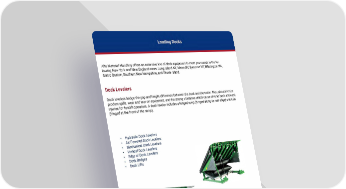 Alta Material Handling offers an extensive line of dock equipment to meet your needs in the folĀ lowing New York and New England areas: Long Island NY, Metro NY, Syracuse NY, Wilmington MA, Metro Boston, Southern New Hampshire, and Rhode Island. Dock Levelers Dock levelers bridge the gap and height difference between the dock and the trailer. They also minimize product spills, wear and tear on equipment. and the strong vibrations which cause chronic back and neck injuries for forklift operators. A dock leveler includes a hinged ramp (hinged along its rear edge) and a lip (hinged at the front of the ramp). Hydraulic Dock Levelers Air Powered Dock Levelers Mechanical Dock Levelers Vertical Dock Levelers Edge of Dock Levelers Dock Bridges Dock Lifts ; ' .. .. . ,