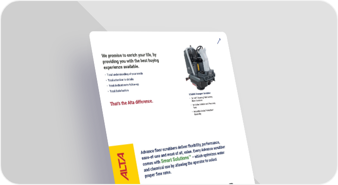 Advance floor scrubbers deliver flexibility, performance, ease-of-use and most of all, value. Every Advance scrubber comes with Smart Solutions™ – which optimizes water and chemical use by allowing the operator to select proper flow rates. We promise to enrich your life, by providing you with the best buying experience available. •T otal understanding of your needs • Total attention to details • Total dedication to follow-up • Total Satisfaction That’s the Alta difference. SC5000 Ride-On Scrubber • 32-36” Cleaning Path • 37 Gallon Solution & Recovery Tanks • Unmatched Maneuverability SC6000 Sweeper-Scrubber • 34”-40” Cleaning Path Battery Rider Scrubber • 50 Gallon Solution and Recovery Tank • Industrial Grade Protection/ Durability SC8000 • Large 100 Gallon Tanks • Uptoa67”Cleaningpath • Rugged Industrial Cylindrical Scrubber • Tilt out Tanks with Max Access to Engine & Hydraulics SC800 & SC750 • Available in 26”, 28” or 34” Scrub Paths • Upto25GallonSolutionand Recovery Tanks • Cylindrical or Disc with Pads or Brushes • Compact and Powerful SC500 • 20” Disc or Cylindrical Scrub Path • Quiet, Meets LEED-ED & GS-42 • 14 Gallon Solution and Recovery Tanks • EcoFlex on Board Detergent Dispensing