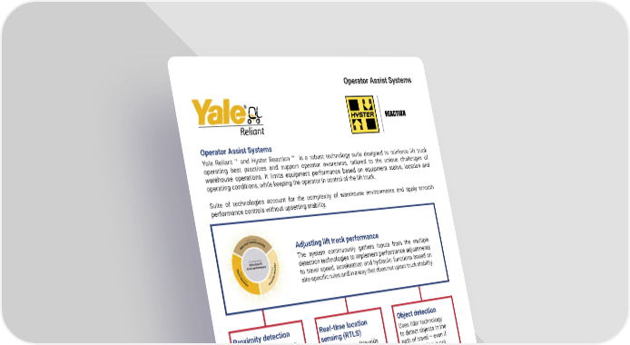 Operator Assist Systems Operator Assist Systems Yale Reliant ™ and Hyster Reaction ™ is a robust technology suite designed to reinforce lift truck operating best practices and support operator awareness, tailored to the unique challenges of warehouse operations� It limits equipment performance based on equipment status, location and operating conditions, while keeping the operator in control of the lift truck� Suite of technologies account for the complexity of warehouse environments and apply smooth performance controls without upsetting stability� Adjusting lift truck performance The system continuously gathers inputs from the multiple detection technologies to implement performance adjustments to travel speed, acceleration and hydraulic functions based on site-speci昀椀c rules and in a way that does not upset truck stability. Proximity detection Real-time location Object detection Uses ultra-wideband tags sensing (RTLS) Uses lidar technology connected to equipment, Uses the same ultra-wide to detect objects in the personnel and facility band network as proximity path of travel – even if infrastructure to provide tags and adds beacons the obstruction is not real-time proximity setup throughout the facility connected to the tag-to- detection that triggers to determine real-time tag mesh network, such as operator alerts and location within sub-meter pedestrians or equipment proactive performance accuracy and enable without Yale Reliant adjustments, such as location-based rules like technology, or debris like speed reduction to equipment exclusion zones a stray box or pallet� maintain proper following and end-of-aisle slowdown� distance behind equipment or help safely navigate around pedestrians� mh�altg�com 13