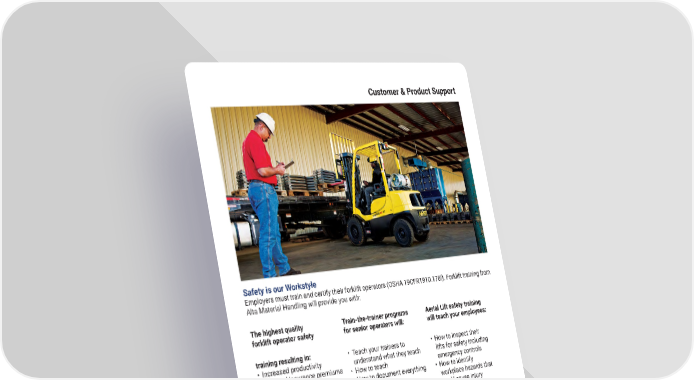 Customer & Product Support Safety is our Workstyle Employers must train and certify their forklift operators (OSHA 19CFR1910�178l)� Forklift training from Alta Material Handling will provide you with: The highest quality Train-the-trainer programs Aerial Lift safety training forklift operator safety for senior operators will: will teach your employees: training resulting in: • Teach your trainers to • How to inspect their • Increased productivity understand what they teach lifts for safety including • Reduced insurance premiums • How to teach emergency controls • Lower insurance costs • How to document everything • How to identify to ensure maximum workplace hazards that employee bene昀椀t and could cause injury adherence to OSHA • How to know fall and ANSI standards Our fully trained professional instructors have trained thousands of forklift operators and trainers on all types of lift trucks� We will put together a cost-effective training program tailored to your speci昀椀c lifts that will help your operators work safely and meet your compliance obligations either in person or online� mh�altg�com 81