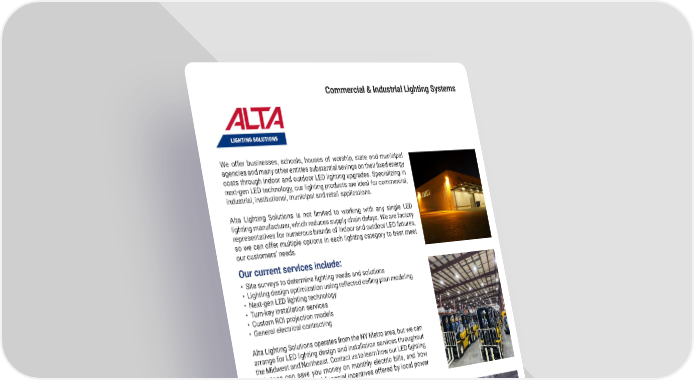 31 mh � altg � com Commercial & Industrial Lighting Systems We offer businesses, schools, houses of worship, state and municipal agencies and many other entities substantial savings on their fixed energy costs through indoor and outdoor LED lighting upgrades � Specializing in next-gen LED technology, our lighting products are ideal for commercial, industrial, institutional, municipal and retail applications � Alta Lighting Solutions is not limited to working with any single LED lighting manufacturer, which reduces supply chain delays � We are factory representatives for numerous brands of indoor and outdoor LED fixtures, so we can offer multiple options in each lighting category to best meet our customers’ needs � Our current services include: • Site surveys to determine lighting needs and solutions • Lighting design optimization using reflected ceiling plan modeling • Next-gen LED lighting technology • Turn-key installation services • Custom ROI projection models • General electrical contracting Alta Lighting Solutions operates from the NY Metro area, but we can arrange for LED lighting design and installation services throughout the Midwest and Northeast � Contact us to learn how our LED lighting solutions can save you money on monthly electric bills, and how you can earn additional financial incentives offered by local power company rebate programs �