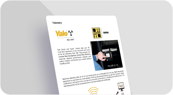 13 mh � altg � com Telemetry Real-time telemetry data on all of your trucks gives you a thorough look into your fleet’s day-to-day operations so your team can work smarter � With our cloud-based service you get 24/7 access to data, notifications, and reports from any device connected to the Internet, including your mobile phone. The telemetry portal can be accessed online or by downloading the mobile app � Yale Vision and Hyster Tracker take your lift truck fleet operations to the next level with state of the art telemetry from Yale � They provide true wireless fleet management, drives fleet efficiency, improves operator performance, reduces your carbon footprint and lowers your overall material handling costs �