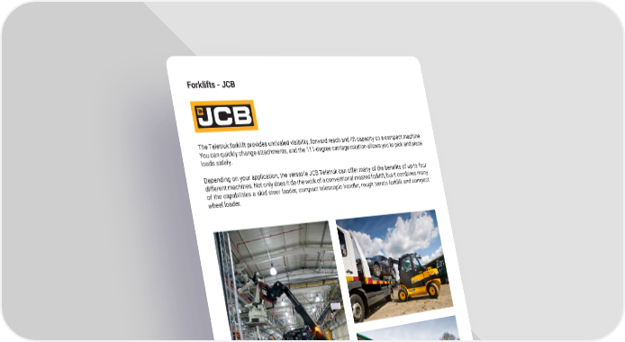 46 mh�altg�com Forklifts - JCB The Teletruk forklift provides unrivaled visibility, forward reach and lift capacity on a compact machine � You can quickly change attachments, and the 111-degree carriage rotation allows you to pick and place loads safely � Depending on your application, the versatile JCB Teletruk can offer many of the benefits of up to four different machines � Not only does it do the work of a conventional masted forklift, but it combines many of the capabilities a skid steer loader, compact telescopic handler, rough terrain forklift and compact wheel loader �