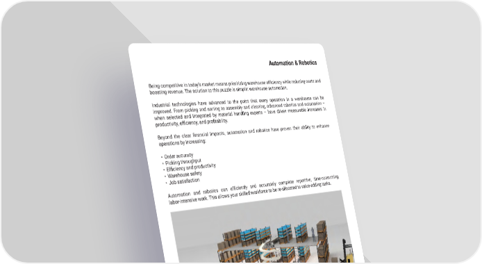 7 mh � altg � com Automation & Robotics Being competitive in today’s market means prioritizing warehouse efficiency while reducing costs and boosting revenue. The solution to this puzzle is simple: warehouse automation. Industrial technologies have advanced to the point that every operation in a warehouse can be improved � From picking and sorting to assembly and cleaning, advanced robotics and automation – when selected and integrated by material handling experts – have driven measurable increases in productivity, efficiency, and profitability. Beyond the clear financial impacts, automation and robotics have proven their ability to enhance operations by increasing: • Order accuracy • Picking throughput • Efficiency and productivity • Warehouse safety • Job satisfaction Automation and robotics can efficiently and accurately complete repetitive, time-consuming, labor-intensive work � This allows your skilled workforce to be re-allocated to value-adding tasks �