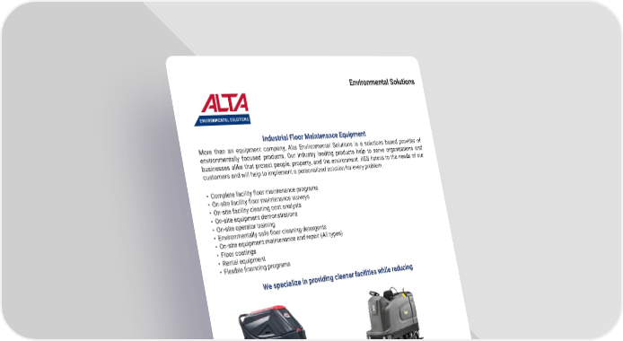 51 mh � altg � com Environmental Solutions Industrial Floor Maintenance Equipment More than an equipment company, Alta Environmental Solutions is a solutions based provider of environmentally focused products � Our industry leading products help to serve organizations and businesses alike that protect people, property, and the environment � AES listens to the needs of our customers and will help to implement a personalized solution for every problem � • Complete facility floor maintenance programs • On-site facility floor maintenance surveys • On-site facility cleaning cost analysis • On-site equipment demonstrations • On-site operator training • Environmentally safe floor cleaning detergents • On-site equipment maintenance and repair (All types) • Floor coatings • Rental equipment • Flexible financing programs We specialize in providing cleaner facilities while reducing