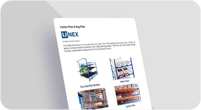 20 mh�altg�com Carton Flow & Keg Flow Roller Rack Unex Manufacturing is a lot more than just carton flow. They design and manufacture a full line of gravity conveyor products tailored to the order picking process. Their flow cells help create durable, modular, and portable workstations for the manufacturing floor. Flow Bed Pick Module Keg Flow Rack Carton Flow Flow Bed
