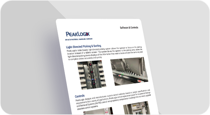 5 mh � altg � com Software & Controls Light-Directed Picking & Sorting PeakLogix’s tablet-based, light-directed picking system allows the operator to focus on the picking location instead of a tablet’s screen � The system drives the operator to the picking zone, where the light-directed picking device displays all the information they need to locate and pick the items required to complete orders accurately and quickly � Controls PeakLogix designs and manufactures custom control cabinets based on project specifications and requirements for a variety of applications � PeakLogix control replacement panel for Automated Storage and Retrieval Systems (AS/RS) uses all non-proprietary components in a design that can easily upgrade obsolete control systems �
