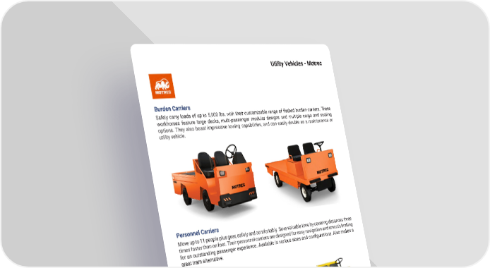 59 mh � altg � com Utility Vehicles - Motrec Burden Carriers Safely carry loads of up to 5,000 lbs. with their customizable range of flatbed burden carriers. These workhorses feature large decks, multi-passenger modular designs and multiple cargo and seating options � They also boast impressive towing capabilities, and can easily double as a maintenance or utility vehicle � Personnel Carriers Move up to 11 people plus gear, safely and comfortably � Save valuable time by covering distances three times faster than on foot � Their personnel carriers are designed for easy navigation and smooth braking for an outstanding passenger experience. Available in various sizes and configurations. Also makes a great tram alternative �