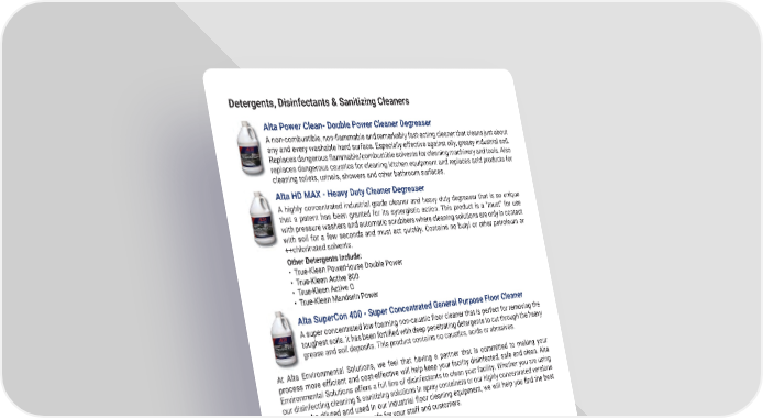 58 mh�altg�com Detergents, Disinfectants & Sanitizing Cleaners At Alta Environmental Solutions, we feel that having a partner that is committed to making your process more efficient and cost-effective will help keep your facility disinfected, safe and clean. Alta Environmental Solutions offers a full line of disinfectants to clean your facility � Whether you are using our disinfecting cleaning & sanitizing solutions in spray containers or our highly concentrated versions that can be diluted and used in our industrial floor cleaning equipment, we will help you find the best solution to keep your facility safe for your staff and customers � AirX Spray n’ Go Disinfectant Cleaner • Kills 99 � 9% of bacteria in 5 seconds • Kills micro-organisms on soft services • Cleans and disinfects hard non porous surface and much more ��� AirX Rx-44ACE • Kills 99 � 9% of bacteria in 5 seconds • Kills micro-organisms on soft services • Cleans and disinfects hard non porous surfaces and much more ��� True-Kleen KLEEN-64 Disinfectant Cleaner One step disinfectant cleaner that is effective against a broad spectrum of bacteria, is virucidal & fungicidal when used as directed � Alta Power Clean- Double Power Cleaner Degreaser A non-combustible, non-flammable and remarkably fast-acting cleaner that cleans just about any and every washable hard surface � Especially effective against oily, greasy industrial soil � Replaces dangerous flammable/combustible solvents for cleaning machinery and tools. Also replaces dangerous caustics for cleaning kitchen equipment and replaces acid products for cleaning toilets, urinals, showers and other bathroom surfaces � Alta HD MAX - Heavy Duty Cleaner Degreaser A highly concentrated industrial grade cleaner and heavy duty degreaser that is so unique that a patent has been granted for its synergistic action � This product is a “must” for use with pressure washers and automatic scrubbers where cleaning solutions are only in contact with soil for a few seconds and must act quickly � Contains no butyl or other petroleum or ++chlorinated solvents � Other Detergents include: • True-Kleen PowerHouse Double Power • True-Kleen Active 800 • True-Kleen Active O • True-Kleen Mandarin Power Alta SuperCon 400 - Super Concentrated General Purpose Floor Cleaner A super concentrated low foaming non-caustic floor cleaner that is perfect for removing the toughest soils. It has been fortified with deep penetrating detergents to cut through the heavy grease and soil deposits � This product contains no caustics, acids or abrasives �