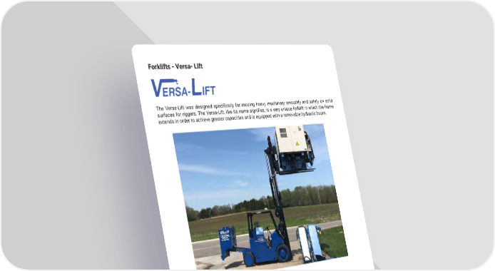 42 mh�altg�com The Versa-Lift was designed specifically for moving heavy machinery smoothly and safely on solid surfaces for riggers. The Versa-Lift, like its name signifies, is a very unique forklift in which the frame extends in order to achieve greater capacities and is equipped with a removable hydraulic boom � Forklifts - Versa- Lift