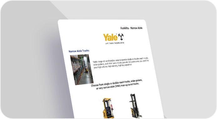 37 mh � altg � com Forklifts - Narrow Aisle Yale’s range of comfortable, easy-to-operate single or double reach trucks, order pickers, and VNA turret trucks provide the productivity you need for your high-volume, high-density, high-bay operation � Narrow Aisle Trucks Choose from single or double reach trucks, order pickers, or very narrow aisle (VNA) man-up turret trucks.