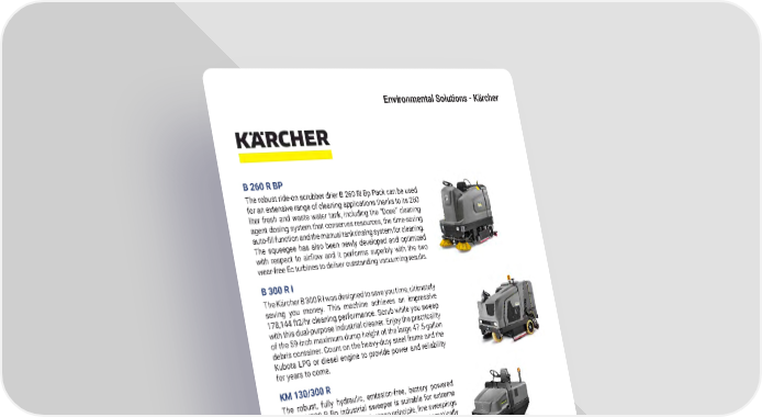 53 mh � altg � com Environmental Solutions - Kärcher KM 130/300 R The robust, fully hydraulic, emission-free, battery powered KM 130/300 R Bp industrial sweeper is suitable for extreme cleaning jobs. Thanks to the dustpan principle, fine sweepings and coarse dirt are vacuumed � The roller brush automatically adjusts to uneven surfaces and the innovative sweeping system reduces wear and tear to a minimum � B 300 R I The Kärcher B 300 R I was designed to save you time, ultimately saving you money � This machine achieves an impressive 178,144 ft2/hr cleaning performance � Scrub while you sweep with this dual-purpose industrial cleaner � Enjoy the practicality of the 59-inch maximum dump height of the large 47 � 5-gallon debris container � Count on the heavy-duty steel frame and the Kubota LPG or diesel engine to provide power and reliability for years to come � KM 75/40 R The KM 75/40 R is the pinnacle of commercial-duty sweepers � Coming standard with maintenance free AGM batteries and an onboard charging system, the KM 75/40 W Bp is self-propelled, traveling up to 2 � 8 MPH, and can climb inclines up to 12% � The standard filter system is 99.5% efficient, preventing fine dust particles from re-entering the environment by utilizing a large suction fan and synthetic pleated filter. B 260 R BP The robust ride-on scrubber drier B 260 RI Bp Pack can be used for an extensive range of cleaning applications thanks to its 260 liter fresh and waste water tank, including the “Dose” cleaning agent dosing system that conserves resources, the time-saving auto-fill function and the manual tank rinsing system for cleaning. The squeegee has also been newly developed and optimized with respect to airflow and it performs superbly with the two wear-free Ec turbines to deliver outstanding vacuuming results �