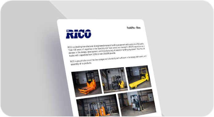 43 mh � altg � com Forklifts - Rico RICO is a leading manufacturer of engineered material handling equipment and custom built lift trucks � Their 130 years of expertise in the Specialty Lift Truck arena has resulted in RICO’S reputation as a pioneer in the design, development, and manufacturing of material handling equipment � Rico has lift trucks with capacities from 3,000 to over 300,000 pounds � RICO is proud to be one of the few companies to be totally self-sufficient in the design, fabrication, and assembly of its products �