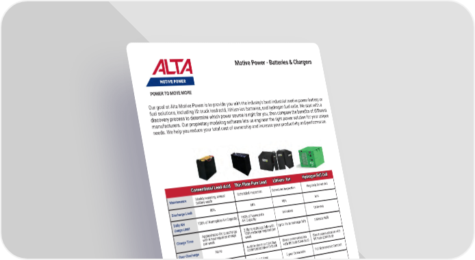 63 mh � altg � com Our goal at Alta Motive Power is to provide you with the industry’s best industrial motive power battery or fuel solutions, including lift truck lead acid, lithium-ion batteries, and hydrogen fuel cells � We start with a discovery process to determine which power source is right for you, then compare the benefits of different manufacturers � Our proprietary modeling software lets us engineer the right power solution for your unique needs � We help you reduce your total cost of ownership and increase your productivity and performance � Motive Power - Batteries & Chargers POWER TO MOVE MORE Conventional Lead-Acid Conventional Lead-Acid Conventional Lead-Acid Lithium- Ion Lithium- Ion Hydrogen Full Cell Hydrogen Full Cell Maintenance Discharge Limit Daily AH Usage Limit Charge Time Over-Discharge Protection Warranty Warranty Cycles Antcipated Life Smart Battery Technology Operator Involvement Disadvantages Weekly watering, annual battery wash 80% 120% of Nameplate AH Capacity None 5 Year 1500 Throughput Cycles 4-5 Year Average Data Logger Proper watering, charging and discharging Scheduled Inspection 60% Scheduled Inspection 95% 160% of Nameplate AH Capacity Audible alarm or CAN Bus communication with truck 3 or 5 Year 1540 Throughput Cycles 3-5 Year Average Data Logger Proper charging and discharging Unlimited Up to 1hr to recharge fully Direct communication with lift truck (CAN Bus) 5 year Extendable 3000 Throughput Cycles 5-10 YEAR BMS Computer and IOT Reporting Proper charging Regularly Scheduled N/A Unlimited 3 Minute Refill Direct communication with lift truck (CAN Bus) Full Maintenance Contract N/A 5-10 YEAR IOT Reporting Proper fuel filling Thin Plate Pure Lead Thin Plate Pure Lead Approximate 4hr to recharge with 6 hour equalize charge per week 2 � 5hr to recharge fully with 100% recharge required per week High maintenance costs, low productivity Short life, limited discharge capacity High equipment cost High infrastructure, fuel, maintenance and equipment costs Benefits Low equipment costs Fast recharge, low maintenance costs Long life, fast recharge, low maintenance costs, low electrical costs High productivity, low emissions, long life