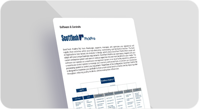 6 mh�altg�com ScottTech PickProTM, from PeakLogix, supports, manages, and optimizes your operational and supply chain activities within your manufacturing, warehousing, and distribution facilities � The Suite of Applications (see below) are modular in design, which allows ScottTech PickProTM to scale and adapt with your unique business requirements � ScottTech PickPro can seamlessly integrate with your current enterprise system and serve in various capacities that are most beneficial to your needs. The software can operate as a warehouse management system to run your facility operations, perform as a warehouse control system to manage your inventory and transactions, or function as a transaction processing system to control your equipment. Regardless of the configuration, ScottTech PickProTM is designed to maximize your profitability from a work center level to a facility level by improving order throughput, reducing quality incidents, and increasing labor efficiencies. ScottTech PickPro is purchased as one time license fee per user � With the purchase of the software, LogixPro is included as a module with administrative and import/export features � Additional modules such as Order Manager, Induction Manager, Consolidation Manager are available to enhance the LogixPro application � PickFace and BulkPro are purchased to integrate with different storage solutions, such as AS/RS or static storage systems � Software & Controls