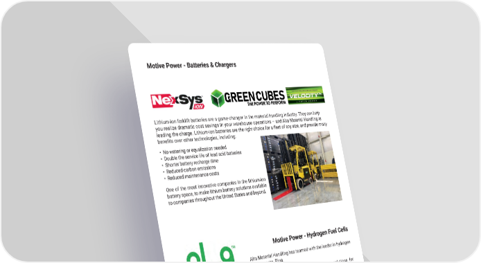 66 mh�altg�com Motive Power - Batteries & Chargers One of the most innovative companies in the lithium-ion battery space, to make lithium battery solutions available to companies throughout the United States and beyond � Lithium-ion forklift batteries are a game-changer in the material handling industry � They can help you realize dramatic cost savings in your warehouse operations – and Alta Material Handling is leading the charge. Lithium-ion batteries are the right choice for a fleet of any size, and provide many benefits over other technologies, including: • No watering or equalization needed • Double the service life of lead acid batteries • Shorter battery recharge time • Reduced carbon emissions • Reduced maintenance costs Motive Power - Hydrogen Fuel Cells Alta Material Handling has teamed with the leader in hydrogen fuel systems, Plug � Plug’s GenDrive fuel cells are drop-in power solutions for existing electric Class 1, Class 2 and Class 3 material handling electric truck fleets. This zero-emission power source for electric lift trucks is a high-productivity alternative to lead acid batteries � They eliminate the need for battery handling, charging, and swapping, and are easily installed and quickly and conveniently refueled � Alta Material Handling provides turn-key hydrogen fuel cell solutions � From initial system engineering and design to fuel delivery and aftermarket maintenance and service �