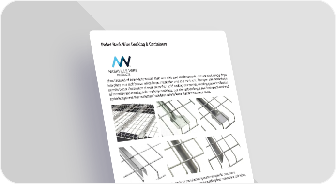21 mh � altg � com Manufactured of heavy-duty welded steel wire with steel reinforcements, our rack deck simply drops into place over rack beams which keeps installation time to a minimum � The open wire mesh design permits better illumination of work areas than solid decking can provide, enabling quick identification of inventory and creating safer working conditions � Our wire rack decking is so effective with overhead sprinkler systems that customers have been able to lower their fire insurance costs. Nashville Wire Products is an industry leader in manufacturing customer specific containers. In addition to unique sizes, NWP can design accessories such as stacking feet, runner bars, fork tubes, pin/posts, dividers, and security lids � Pallet Rack Wire Decking & Containers
