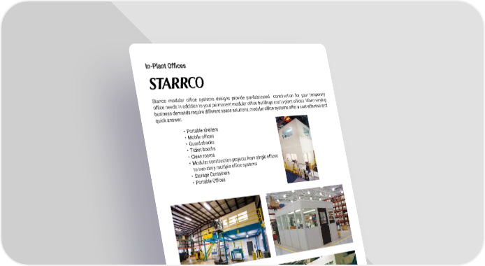 24 mh�altg�com In-Plant Offices Starrco modular office systems designs provide pre-fabricated construction for your temporary office needs in addition to your permanent modular office buildings and in-plant offices. When varying business demands require different space solutions, modular office systems offer a cost-effective and quick answer � • Portable shelters • Mobile offices • Guard shacks • Ticket booths • Clean rooms • Modular construction projects from single offices to two-story multiple office systems • Storage Containers • Portable Offices