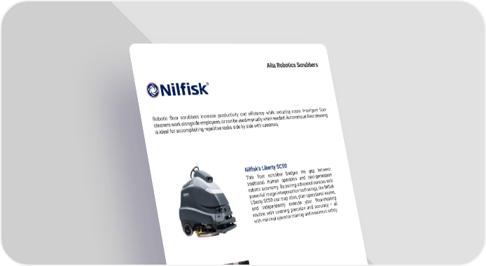 11 mh � altg � com Alta Robotics Scrubbers Nilfisk’s Liberty SC50 This floor scrubber bridges the gap between traditional human operation and next-generation robotic autonomy � By pairing advanced sensors with powerful image-interpretation technology, the Nilfisk Liberty SC50 can map sites, plan operational routes, and independently execute your floor-cleaning routine with unerring precision and accuracy – all with minimal operator training and maximum safety � Robotic floor scrubbers increase productivity and efficiency while reducing costs. Intelligent floor cleaners work alongside employees, or can be used manually when needed. Autonomous floor cleaning is ideal for accomplishing repetitive tasks side by side with operators � Liberty SC60 Built on Brain Corp’s powerful Brain OS – the world’s most widely-used autonomous operating system – the high-performance Liberty SC60 also has the market’s largest autonomous ride-on, exemplary runtime, and minimal downtime requirements �