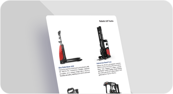 9 mh � altg � com Robotic Lift Trucks Autonomous Reach Truck Enhance the efficiency of equipment movement, material stacking, and lifting with an Autonomous Reach Truck � Designed to achieve automatic and flexible material handling without changing the existing procedures or infrastructures, which greatly improves logistics efficiency. Slim Pallet Mover AGV Experience seamless trailer loading and unloading with the VNST20 Pro � Autonomous operation, advanced perception, and a compact design deliver efficiency, flexibility and safety, handling up to 4,409 lb with ease. Counterbalance Truck The counterbalance truck AGV/AMR is designed to efficiently achieve indoor and outdoor automatic material handling, material loading and unloading, in and out � Counterbalance Stacker The counterbalance stacker AGV/AMR designed to achieve automatic and flexible material handling, material inbound and outbound, greatly improving logistics efficiency.