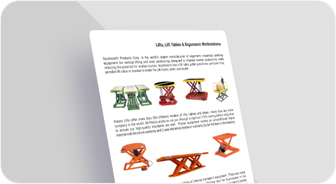 29 mh � altg � com Lifts, Lift Tables & Ergonomic Workstations Presto Lifts offer more than 500 different models of lifts, tables, and tilters - more than any other company in the world � All Presto products are put through a rigorous 110% testing before shipment, to ensure our high-quality standards are met � Presto equipment carries an unconditional 5-year mechanical/structure warranty and 2 year electrical/hydraulic warranty, by far the best in the Industry � Southworth Products Corp � is the world’s largest manufacturer of ergonomic materials handling equipment for vertical lifting and work positioning, designed to improve worker productivity while reducing the potential for worker injuries � Southworth has a lift table, pallet positioner, container tilter, portable lift table or stacker to make the job faster, safer, and easier � Interthor is one of the world’s leading providers of internal transport equipment � There are many ways to improve your working environment, but the most effective tool for businesses in the material handling industry, is to look at workplace ergonomics � There is a lot to gain when it comes to workplace ergonomics - in terms of the health and wellbeing of your employees, and in terms of efficiency and performance �