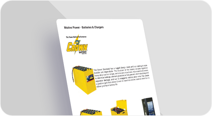 64 mh�altg�com Motive Power - Batteries & Chargers Max delivers the reliability and tough, long-lasting performance of traditional flat-plate batteries with a staggered vertical plate that withstands the rigors of deep cycling services and high-rate discharge � The Crown Standard has a rugged design inside and out making it more durable and dependable � The structure of this battery includes signature heavy-duty cast-on straps, terminal post structures, heat-sealed cell covers to minimize leakage, element protector to help prevent short-circuiting and separator damage, and our 13 staggered vertical plate wires that create a positive grid that allows Crown to maximize active material retention to deliver premium battery life � H2GO can simply be described in two sentences � Less water � Less Maintenance. Our modified alloy reduces gassing which improves water retention � Access Power House Charger is designed for wall or rack mounting, it has a durable case that is coated and textured with a powder polyester finish to protect against corrosion �
