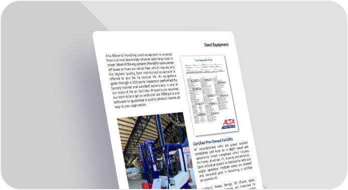 73 mh � altg � com Used Equipment Alta Material Handling used equipment is sourced from our vast dealership network spanning coast to coast � Most of the equipment offered for sale comes off lease or from our rental fleet, which insures only the highest quality, best maintained equipment is offered to you for its second life � All equipment goes through a 200 point inspection performed by factory trained and certified technicians in one of our state of the art facilities � If repairs are required, our technicians get to work and use OEM parts and software to guarantee a quality product makes its way to your application � Truck Inspection Form Certified Pre-Owned Forklifts All reconditioned units are power washed completely and have an in depth visual and operational check completed which includes the frame, drivetrain, lift, steering and electrical � Each individual system is checked for safe and proper operation � Problem areas are notated and corrected prior to becoming a certified pre-owned unit � Hydraulic hoses, fittings, lift chains, axles, brakes, and attachments are inspected for wear or damage and are replaced as needed � Any lights, horns, or backup alarms are verified for proper operation and replaced as needed � Frames and welds are inspected for cracks or misalignment. All fluids are changed, and the unit is checked for leaks � Engine compression is checked for proper readings per OEM Service Manual and any issues with the engine are addressed as needed (LP units only) � Tires and seats are replaced with new parts and each unit receives a full paint job � All parts used are Hyster or Yale OEM parts installed by factory trained and certified technicians.
