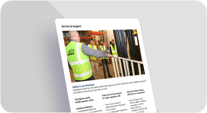 70 mh�altg�com Safety is our Workstyle Employers must train and certify their forklift operators (OSHA 19CFR1910 � 178l) � Forklift training from Alta Material Handling will provide you with: The highest quality forklift operator safety Train-the-trainer programs for senior operators will: Aerial Lift safety training will teach your employees: Our fully trained professional instructors have trained thousands of forklift operators and trainers on all types of lift trucks � We will put together a cost-effective training program tailored to your specific lifts that will help your operators work safely and meet your compliance obligations either in person or online � training resulting in: • Increased productivity • Reduced insurance premiums • Lower insurance costs • Teach your trainers to understand what they teach • How to teach • How to document everything to ensure maximum employee benefit and adherence to OSHA and ANSI standards • How to inspect their lifts for safety including emergency controls • How to identify workplace hazards that could cause injury • How to know fall Service & Support