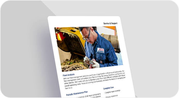 69 mh � altg � com Service & Support Fleet Analysis With our fleet management solutions, you’ll see a huge benefit in efficiency and productivity. Our fleet management team will analyze your fleet on things like energy, downtime, running time, and other metrics. We’ll work with you to develop a plan for a more efficient workplace and reduce overall operating costs � Focus on running your business, and leave the details of managing your fleet to us. • Professional inspection of all major components and systems, including fluids and safety devices • Written report detailing current condition of each unit Flexible, reliable scheduling • Two-hour guaranteed response time Complete Care • Complete repair coverage • Regular inspections • Highly-trained service technicians • 48-hour loaner guarantee • One monthly invoice • Guaranteed service response time • Parts, labor, supplies, travel time included • Free program estimates for your existing fleet Periodic Maintenance Plan