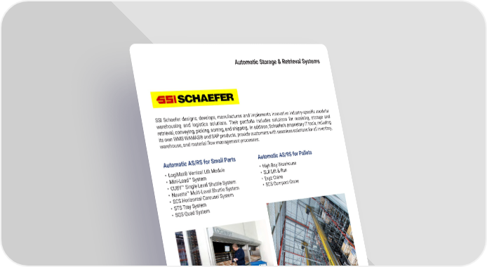 14 mh�altg�com Automatic Storage & Retrieval Systems SSI Schaefer designs, develops, manufactures and implements innovative industry-specific modular warehousing and logistics solutions � Their portfolio includes solutions for receiving, storage and retrieval, conveying, picking, sorting, and shipping � In addition, Schaefer’s proprietary IT tools, including its own WMS WAMAS® and SAP products, provide customers with seamless solutions for all inventory, warehouse, and material flow management processes. Automatic AS/RS for Small Parts • LogiMat® Vertical Lift Module • Mini-Load™ System • CUBY™ Single Level Shuttle System • Navette™ Multi-Level Shuttle System • SCS Horizontal Carousel System • STS Tray System • SQS Quad System Automatic AS/RS for Pallets • High Bay Warehouse • SLR Lift & Run • Exyz Crane • SCS Compact Crane