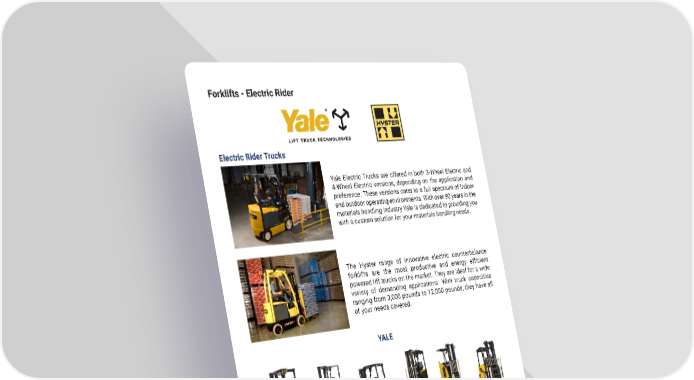 36 mh�altg�com Forklifts - Electric Rider Yale Electric Trucks are offered in both 3-Wheel Electric and 4-Wheel Electric versions, depending on the application and preference � These versions cater to a full spectrum of indoor and outdoor operating environments � With over 90 years in the materials handling industry Yale is dedicated to providing you with a custom solution for your materials handling needs � Electric Rider Trucks HYSTER YALE The Hyster range of innovative electric counterbalance forklifts are the most productive and energy efficient powered lift trucks on the market � They are ideal for a wide variety of demanding applications � With truck capacities ranging from 3,000 pounds to 12,000 pounds, they have all of your needs covered �
