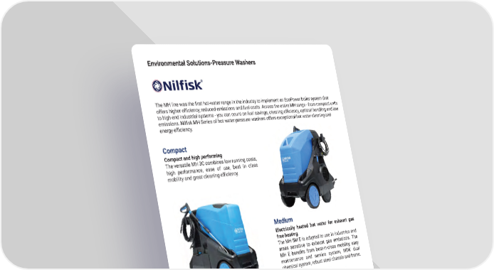 Environmental Solutions-Pressure Washers The MH line was the 昀椀rst hot-water range in the industry to implement an EcoPower boiler system that offers higher e昀케ciency, reduced emissions and fuel costs. Across the entire MH range - from compact units to high-end industrial systems - you can count on fuel savings, cleaning e昀케ciency, optimal handling and low emissions. Nil昀椀sk MH Series of hot water pressure washers offers exceptional hot water cleaning and energy e昀케ciency. Compact Compact and high performing The versatile MH 3C combines low running costs, high performance, ease of use, best in class mobility and great cleaning e昀케ciency. Medium Electrically heated hot water for exhaust gas free heating The MH 5M E is adapted to use in industries and areas sensitive to exhaust gas emissions� The MH E bene昀椀ts from best-in-class mobility, easy maintenance and service system, WDK dual chemical system, robust steel chassis and frame� Premium Heavy duty and e昀케cient hot water cleaning for intense use The tough and robust MH 7P series combines low running costs, ease of use, best in class mobility and high cleaning e昀케ciency. The most effective tool for heavy duty, industrial hot water cleaning in any sector� mh.altg.com 68