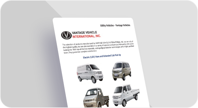 Utility Vehicles - Vantage Vehicles The selection of products manufactured by VANTAGE VEHICLE INTERNATIONAL, INC� are not only of the highest quality, but are also available in a variety of options to ensure you 昀椀nd exactly what you’re looking for. With top-of-the-line materials, cutting-edge production technologies and a highly quali昀椀ed team, they guarantee complete satisfaction� Electric (LSV) Vans and Extended Cab Pick Up OPTIONS & ACCESSORIES mh�altg�com 71