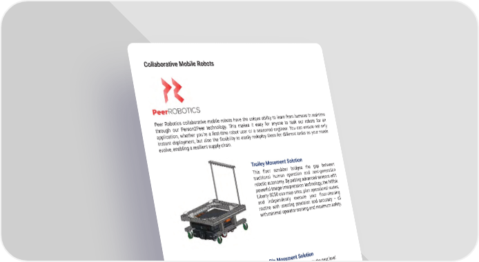 Collaborative Mobile Robots Peer Robotics collaborative mobile robots have the unique ability to learn from humans in real-time through our Person2Peer technology� This makes it easy for anyone to task our robots for an application, whether you’re a 昀椀rst-time robot user or a seasoned engineer. You can ensure not only instant deployment, but also the 昀氀exibility to easily redeploy them for different tasks as your needs evolve, enabling a resilient supply chain� Trolley Movement Solution This 昀氀oor scrubber bridges the gap between traditional human operation and next-generation robotic autonomy� By pairing advanced sensors with powerful image-interpretation technology, the Nil昀椀sk Liberty SC50 can map sites, plan operational routes, and independently execute your 昀氀oor-cleaning routine with unerring precision and accuracy – all with minimal operator training and maximum safety� Bin Movement Solution Take your assembly lines to the next level by unlocking the bene昀椀ts of human-robot collaboration� While your employees can use their expertise to prepare kits in stores, let our RM250 handle the heavy-lifting by autonomously picking and delivering them to wherever they’re needed on the shop 昀氀oor on demand. mh.altg.com 10