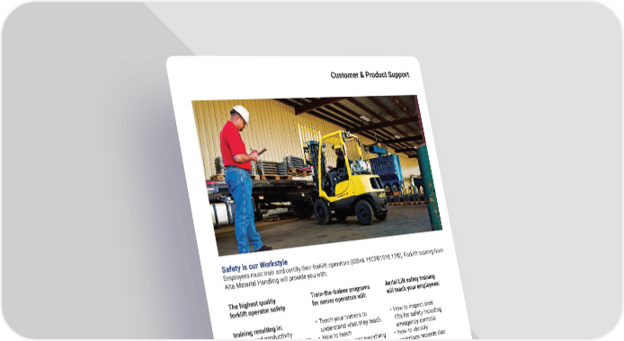 Customer & Product Support Safety is our Workstyle Employers must train and certify their forklift operators (OSHA 19CFR1910�178l)� Forklift training from Alta Material Handling will provide you with: The highest quality Train-the-trainer programs Aerial Lift safety training forklift operator safety for senior operators will: will teach your employees: training resulting in: • Teach your trainers to • How to inspect their • Increased productivity understand what they teach lifts for safety including • Reduced insurance premiums • How to teach emergency controls • Lower insurance costs • How to document everything • How to identify to ensure maximum workplace hazards that employee bene昀椀t and could cause injury adherence to OSHA • How to know fall and ANSI standards protection requirements Our fully trained professional instructors have trained thousands of forklift operators and trainers on all types of lift trucks� We will put together a cost-effective training program tailored to your speci昀椀c lifts that will help your operators work safely and meet your compliance obligations either in person or online� mh�altg�com 85