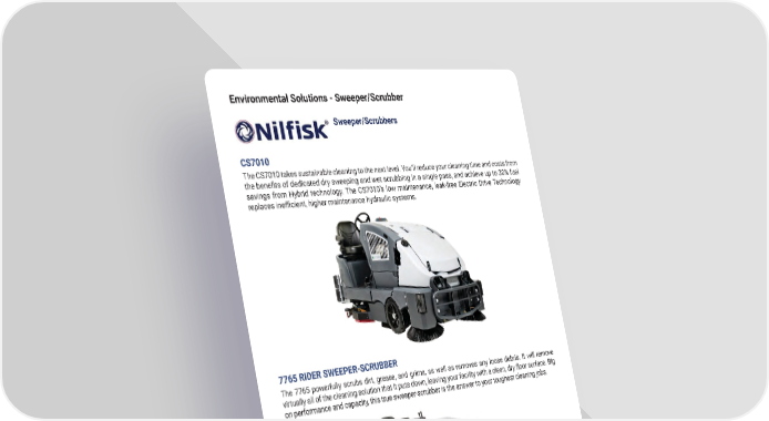 Environmental Solutions - Sweeper/Scrubber Sweeper/Scrubbers CS7010 The CS7010 takes sustainable cleaning to the next level� You’ll reduce your cleaning time and costs from the bene昀椀ts of dedicated dry sweeping and wet scrubbing in a single pass, and achieve up to 30% fuel savings from Hybrid technology� The CS7010’s low maintenance, leak-free Electric Drive Technology replaces ine昀케cient, higher maintenance hydraulic systems. 7765 RIDER SWEEPER-SCRUBBER The 7765 powerfully scrubs dirt, grease, and grime, as well as removes any loose debris� It will remove virtually all of the cleaning solution that it puts down, leaving your facility with a clean, dry 昀氀oor surface. Big on performance and capacity, this true sweeper-scrubber is the answer to your toughest cleaning jobs� mh.altg.com 64