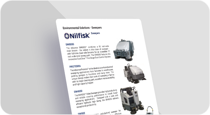 Environmental Solutions - Sweepers Sweepers SW8000 The Advance SW8000™ combines a 50 inch-wide main broom - the widest in this class of sweeper - with full-time dual side brooms for an incredible 77 inch wide total sweep path� The SW8000 features the innovative DustClear™ Five Stage Dust Control System� PROTERRA The Advance Proterra™ is the ideal solution for industrial sweeping applications from factories to warehouses, parking garages to foundries and many more� The unique design makes fast work of sweeping a facility with its large cleaning path, excellent maneuverability, and high capacity hopper� SW4000 The SW4000™ Rider Sweeper provides high productivity and reliable cleaning performance to attack tough sweeping applications� Designed with a safe and e昀케cient hydraulic high dump, the SW4000 delivers exceptional productivity� SW900 The Advance SW900™ walk-behind sweeper for both indoor and outdoor use offers effective dust-free removal of dry debris� The SW900 is an ideal sweeper for cleaning contractors, industry and manufacturing, schools, warehouses, hotels, exhibitions, & convention centers� TERRA 28B The performance of Advance’s Terra 28B walk behind sweeper leaves wide-area vacuums in the dust� Compact and easy to maneuver, the Terra 28B is one of the quietest sweepers in the industry� mh.altg.com 62