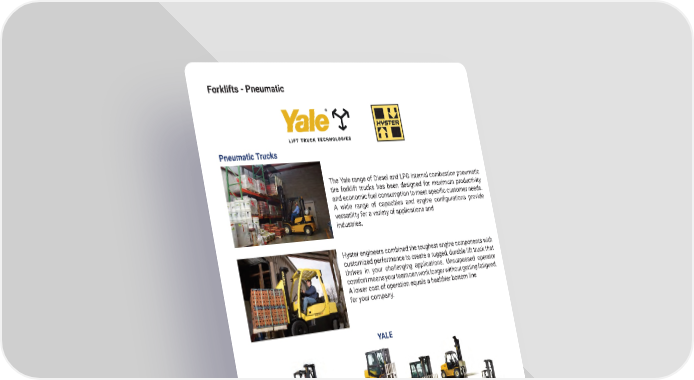 Forklifts - Pneumatic Pneumatic Trucks The Yale range of Diesel and LPG internal combustion pneumatic tire forklift trucks has been designed for maximum productivity and economic fuel consumption to meet speci昀椀c customer needs. A wide range of capacities and engine con昀椀gurations provide versatility for a variety of applications and industries� Hyster engineers combined the toughest engine components with customized performance to create a rugged, durable lift truck that thrives in your challenging applications� Unsurpassed operator comfort means your team can work longer without getting fatigued� A lower cost of operation equals a healthier bottom line for your company� YALE HYSTER mh.altg.com 40
