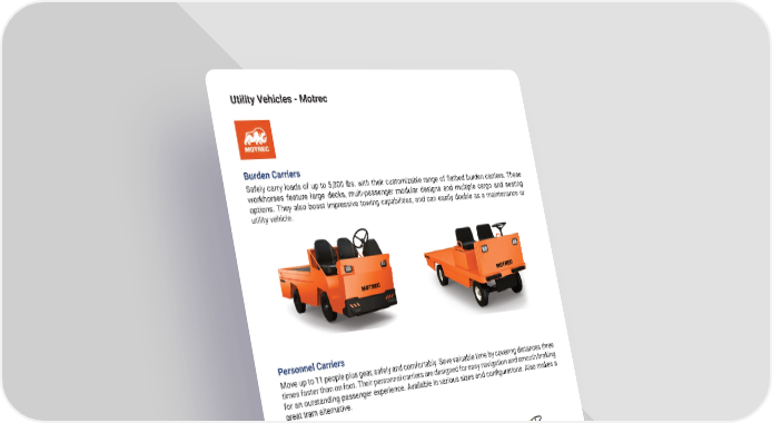 Utility Vehicles - Motrec Burden Carriers Safely carry loads of up to 5,000 lbs. with their customizable range of 昀氀atbed burden carriers. These workhorses feature large decks, multi-passenger modular designs and multiple cargo and seating options� They also boast impressive towing capabilities, and can easily double as a maintenance or utility vehicle� Personnel Carriers Move up to 11 people plus gear, safely and comfortably� Save valuable time by covering distances three times faster than on foot� Their personnel carriers are designed for easy navigation and smooth braking for an outstanding passenger experience. Available in various sizes and con昀椀gurations. Also makes a great tram alternative� mh.altg.com 58