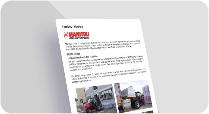 Forklifts - Manitou Manitou’s line of rough terrain forklifts that incorporate enhanced ergonomics and environmentally friendly diesel engines makes them a perfect choice for your toughest applications� With capacities from 5,000 lbs� to 15,000 lbs� Manitou has a solution for all your rough terrain challenges� M/MC Series Lift Capacities from 5,000-15,000 lbs. Get your material handling operations done quickly and safely with Manitou’s M/MC series all-terrain forklifts� Renowned for their durability and unprecedented lifting capacity, these high-performance machines can go where other ranges cannot� Take advantage of their sturdiness and versatility to increase your productivity! The M/MC range offers 5 models of rough terrain forklifts� With their outstanding features, they offer a wide range of bene昀椀ts to our customers who use them to improve productivity and achieve excellent performance� mh.altg.com 50