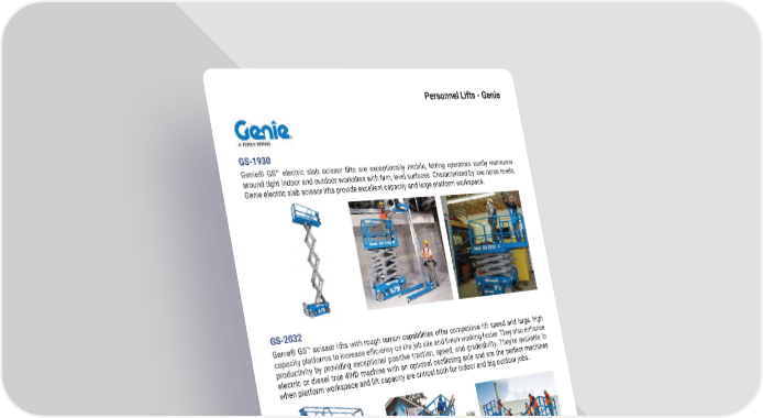 Personnel Lifts - Genie GS-1930 Genie® GS™ electric slab scissor lifts are exceptionally mobile, letting operators easily maneuver around tight indoor and outdoor worksites with 昀椀rm, level surfaces. Characterized by low noise levels, Genie electric slab scissor lifts provide excellent capacity and large platform workspace� GS-2032 Genie® GS™ scissor lifts with rough terrain capabilities offer competitive lift speed and large, high capacity platforms to increase e昀케ciency on the job site and 昀椀nish working faster. They also enhance productivity by providing exceptional positive traction, speed, and gradeability� They’re available in electric or diesel true 4WD machine with an optional oscillating axle and are the perfect machines when platform workspace and lift capacity are critical both for indoor and big outdoor jobs� mh�altg�com 59
