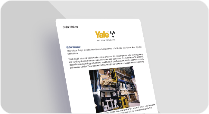 Order Pickers Order Selector This unique design provides the ultimate in ergonomics� It is ideal for Very Narrow Aisle high bay applications� Yale® OS-EF industrial forklift trucks excel in situations that require operator order selecting, picking and handling of various items in multi-level, narrow aisle applications� The trucks feature 24-volt power, state-of-the-art technology with in昀椀nitely variable travel speeds, excellent visibility, ergonomic controls, and operator comfort� These features combine for high truck performance & greater operator productivity� The Yale MO series of low level order pickers takes order picking to a new level. This is a low level order picker designed to ensure your operators are more comfortable and your business more productive� mh.altg.com 54