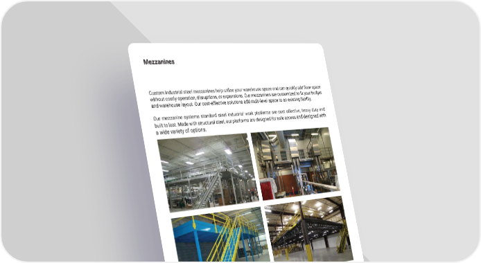 Mezzanines Custom industrial steel mezzanines help utilize your warehouse space and can quickly add 昀氀oor space without costly operation, disruptions, or expansions. Our mezzanines are customized to 昀椀t your budget and warehouse layout� Our cost-effective solutions add multi-level space to an existing facility� Our mezzanine systems standard steel industrial work platforms are cost effective, heavy duty and built to last� Made with structural steel, our platforms are designed for safe access and designed with a wide variety of options� mh.altg.com 18