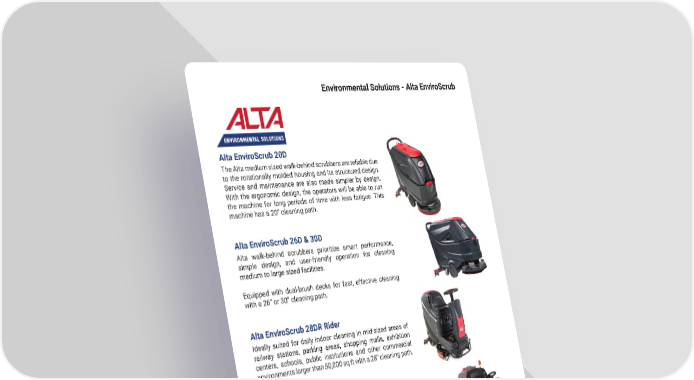 Environmental Solutions - Alta EnviroScrub Alta EnviroScrub 20D The Alta medium sized walk-behind scrubbers are reliable due to the rotationally molded housing and its structured design� Service and maintenance are also made simpler by design� With the ergonomic design, the operators will be able to run the machine for long periods of time with less fatigue� This machine has a 20” cleaning path� Alta EnviroScrub 26D & 30D Alta walk-behind scrubbers prioritize smart performance, simple design, and user-friendly operation for cleaning medium to large sized facilities� Equipped with dual-brush decks for fast, effective cleaning with a 26” or 30” cleaning path� Alta EnviroScrub 28DR Rider Ideally suited for daily indoor cleaning in mid-sized areas of railway stations, parking areas, shopping malls, exhibition centers, schools, public institutions and other commercial environments larger than 50,000 sq ft with a 28” cleaning path� Alta EnviroScrub 39DR Rider Designed with truly massive 昀氀oor space in mind, the 39DR is Alta’s largest ride-on scrubber, but don’t let the size fool you – it’s still compact and maneuverable, and built with safety, productivity, and resource-e昀케ciency in mind. Your staff will appreciate intuitive controls and simple operation, along with a smart and durable design & a 39” cleaning path� mh�altg�com 55